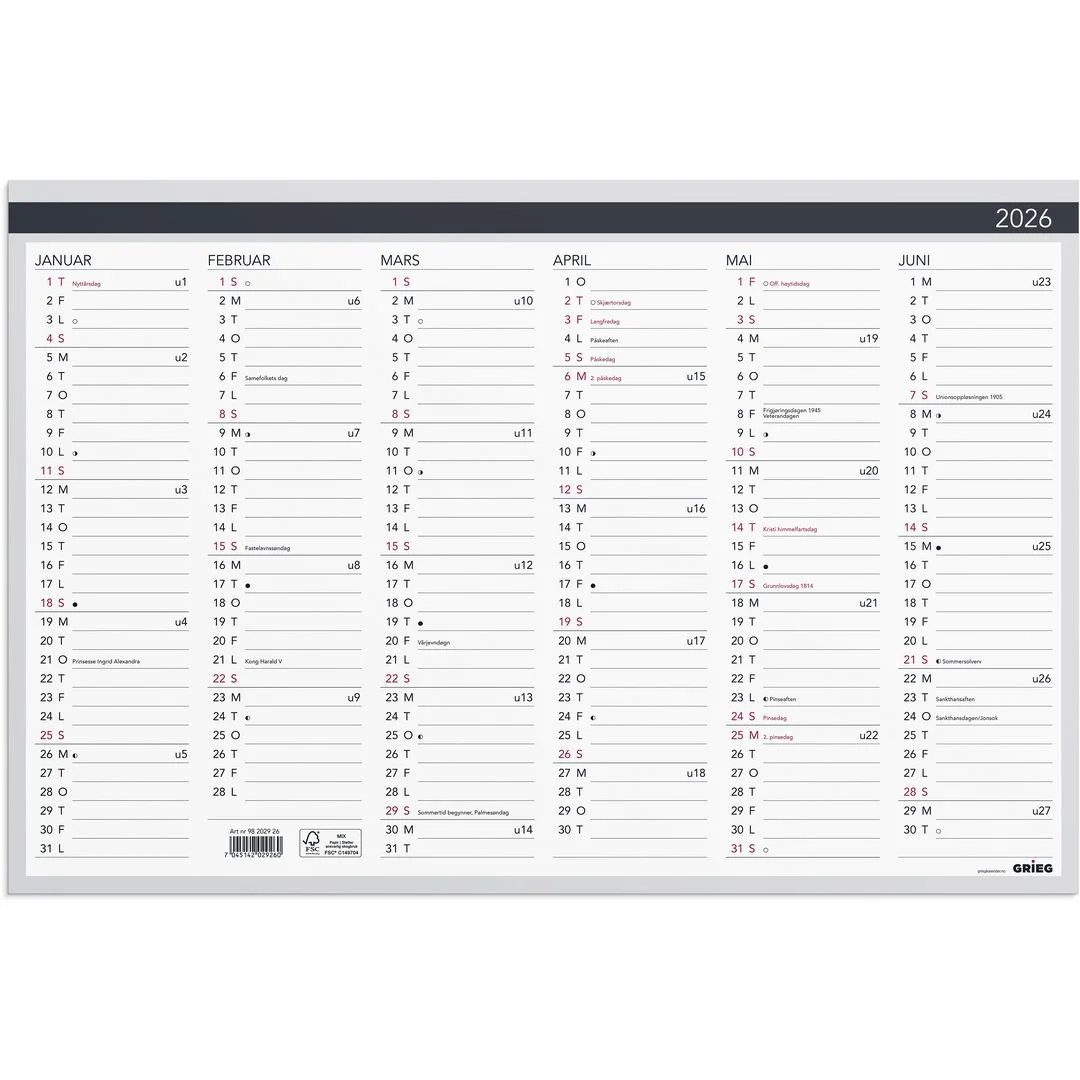 Bordkalender GRIEG 2026 uke