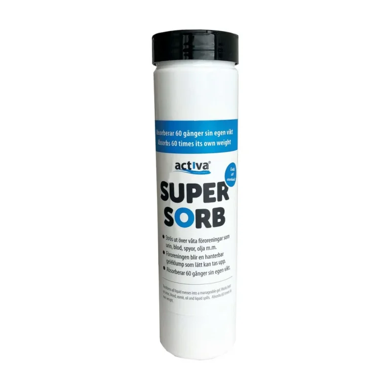 Hell Activa SuperSorb over væsken, middelet absorberer væsken og gjør den om til håndterbar gelé som enkelt kan feies opp. Strøs ut over våte forurensninger som urin, blod, oppkast, olje osv. Forurensningen blir til en håndterbar gelékule som enkelt kan fjernes Absorberer 60 ganger sin egen vekt 350gr EUH208 Inneholder 3-jod-2-propynylbutylkarbamat, Limonene, Liinalool. Kan gi en allergisk reaksjon.