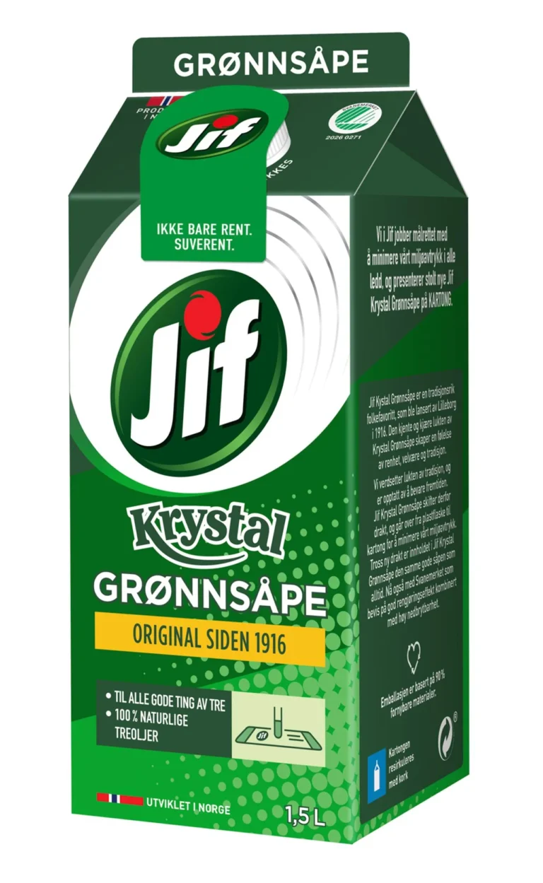 Jif Krystal Grønnsåpe er laget av rene treoljer og passer til å vaske alle typer treverk, inkludert parkett, ubehandlet tre, laminat og andre vaskbare flater.