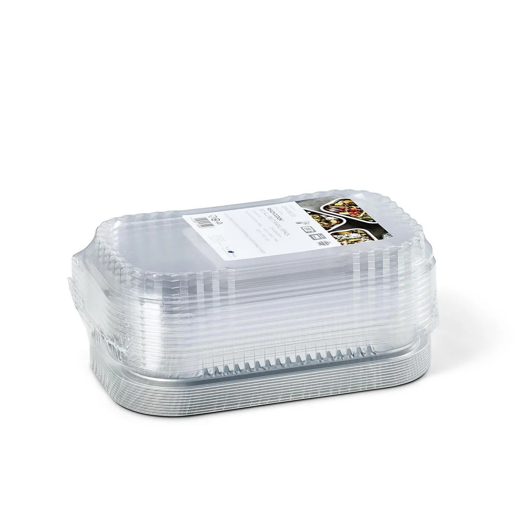 Aluminiumsformer med lokk, for oppbevaring og tilberedning av kjøtt, fisk og grønnsaker. Formen kan gå direkte fra fryst tilstand til ovn.