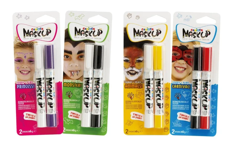 Ansiktsmaling fra Carioca. Fargestifter i 2 forskjellige farger. 4 ass. (dyr, monster, karneval, prinsesse). Fra 3 år.