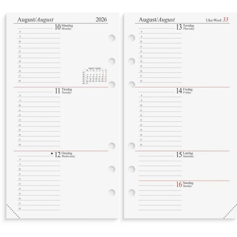 Årspakke for systemkalender med norsk og engelsk kalendarium. Denne årspakken har ukeoppslag, som betyr at du har hele uken over to sider. Dette gir god oversikt over dine ukentlige avtaler. Den har uttrekkbar månedsplanlegger for inneværende år. Årspakken passer til de fleste systemkalendere. Den inneholder kalendariske opplysninger, telefonguide, månedsoversikt, årsoversikt, månefaser, helligdager og kongelige fødselsdager. Kalenderen er miljømerket FSC®, som betyr at produktet er produsert med papir og annet trevirke fra et ansvarlig og bærekraftig skogsbruk. – Følger kalenderåret – Hullet for ringmekanisme – Passer til de fleste planleggingssystemer – Liggende uke/oppslag Timeinndeling 8-18 – Månedsplaner og årsoversikt for inneværende og kommende år – Månefaser, helligdager og kongelige fødselsdager – Norsk og engelsk kalendarium – Linjerte notatsider – Hjørneperforering – 132 sider – 70g papir – Format: 92x168mm