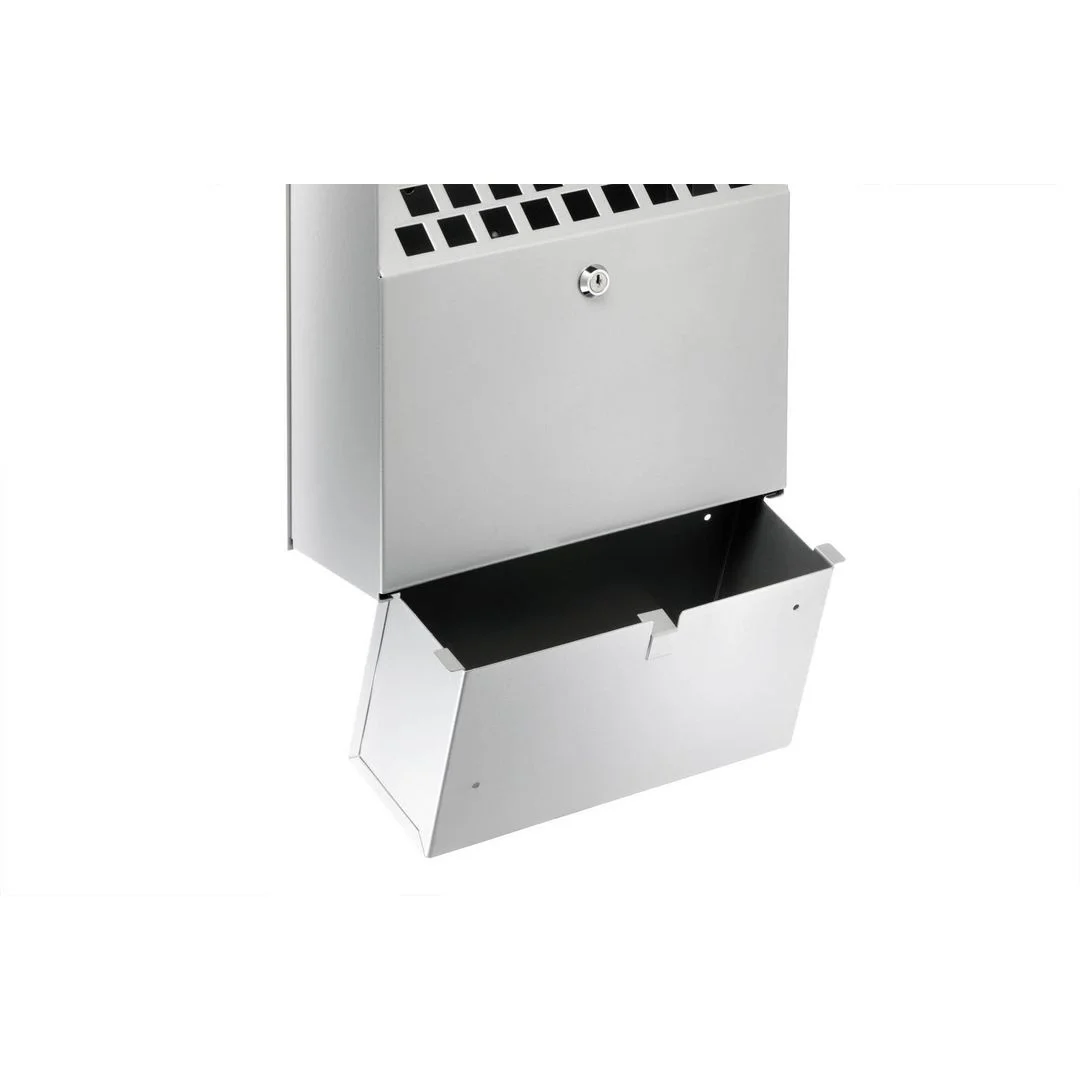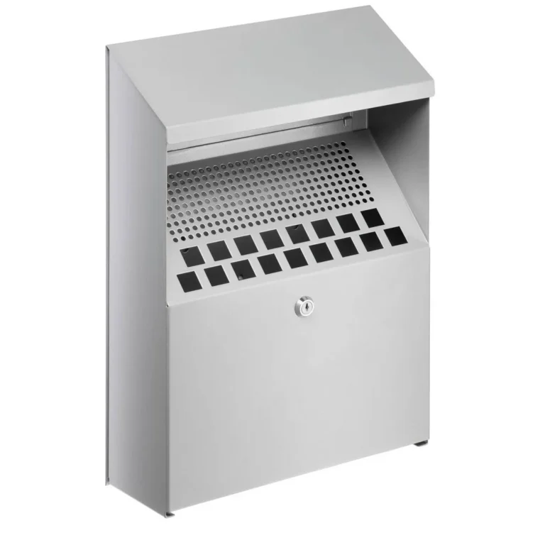 Praktisk askebeger av metall med ripefast overflate av polyester som er velegnet for utendørs veggmontering.