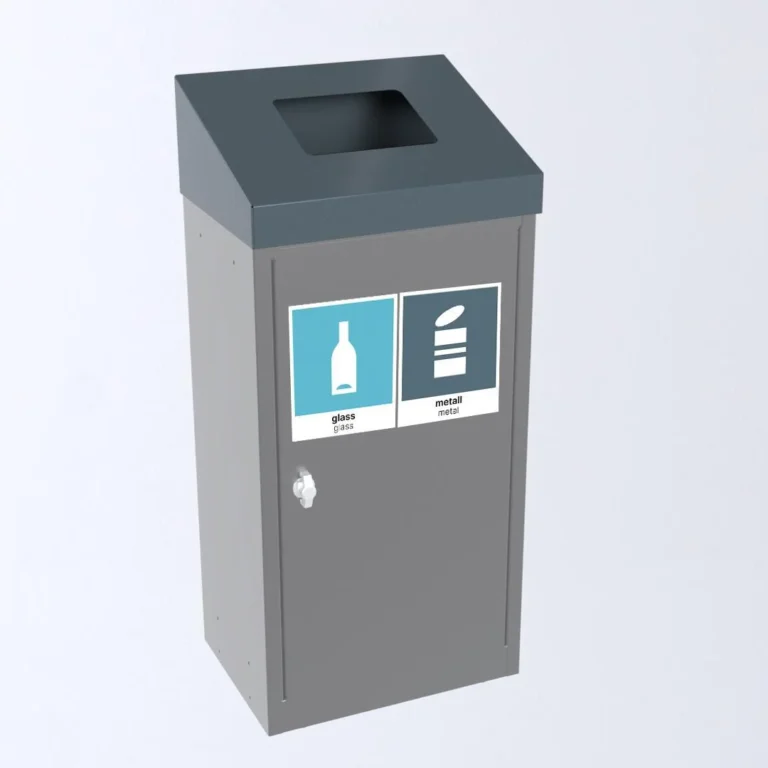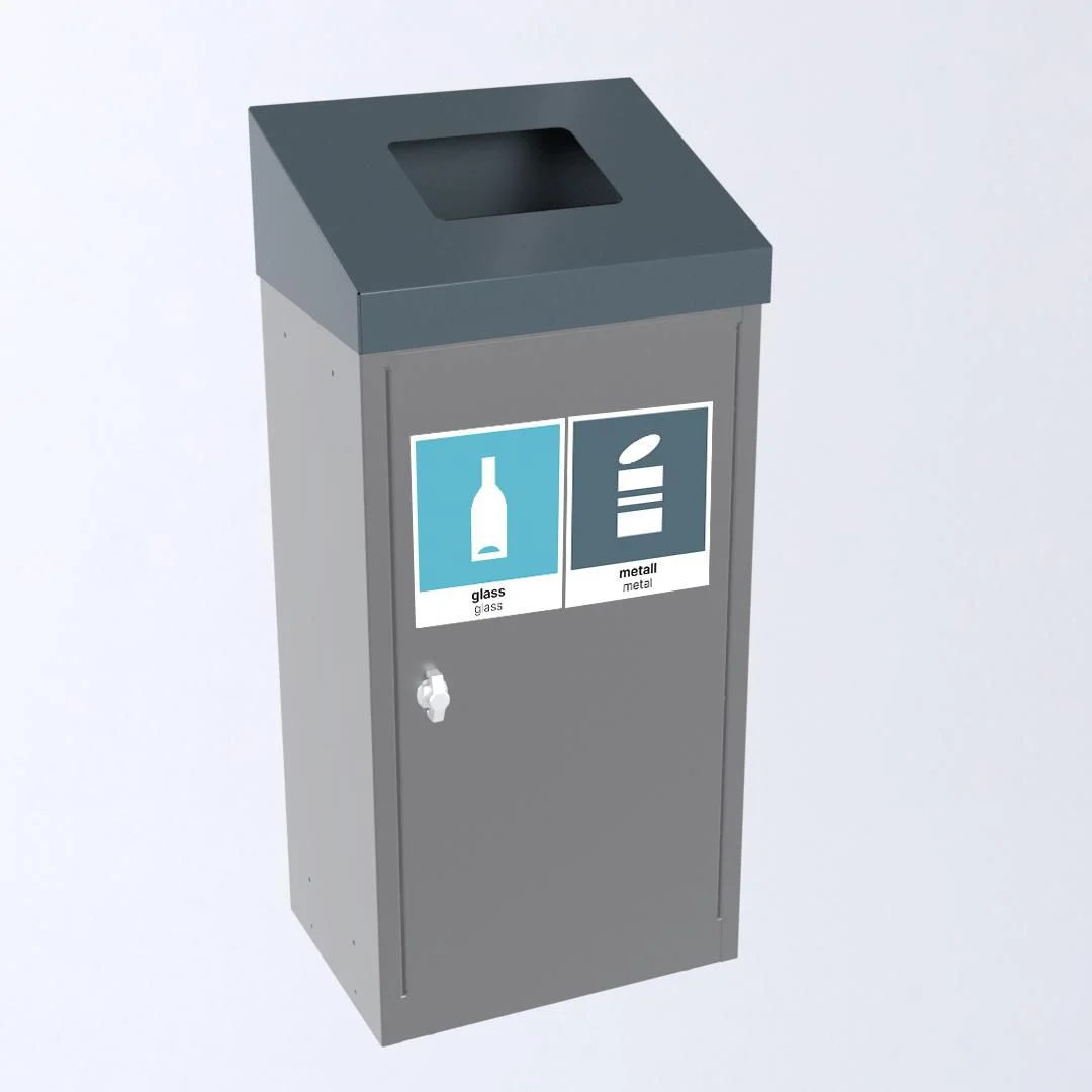 En komplett avfallsbeholder på hjul/fotskruer i pulverlakkert stål med dør. Toppen er lakkert grå, påsatt to etiketter glass + metall.
