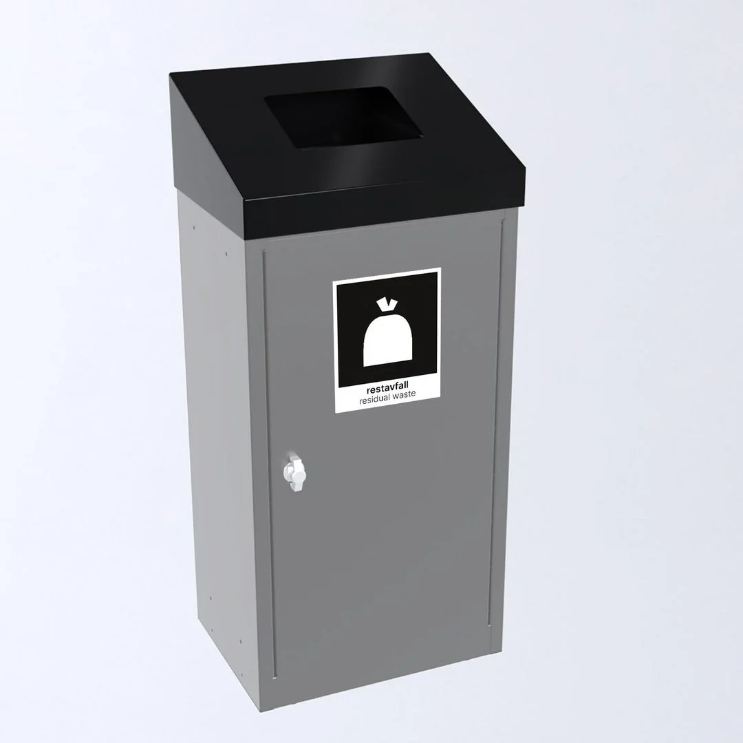 En komplett avfallsbeholder på hjul/fotskruer i pulverlakkert stål med dør. Toppen er lakkert sort, samme farge som påsatt etikett restavfall.