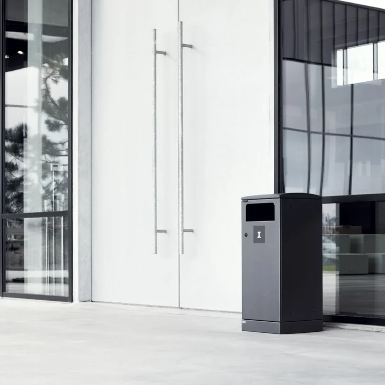Avfallsbeholderen er utstyrt med inngangsdør for ergonomisk riktig tømming uten tunge løft. Avfallsbeholderen er utstyrt med en integrert og sterk poseholder slik at posen holder seg på plass. Den lukkede toppen skjuler posen samtidig, så avfallsbeholderen beholder et stilig design. Den kan festes fast i underlaget, slik at den ikke kan flyttes og samtidig låses. For å oppnå lang levetid og minimalt vedlikehold er avfallsbeholderen laget av rustfritt stål. Det stilige designet og de rene linjene gjør den til en avfallsbeholder som naturlig kan integreres i de fleste utemiljøer. Utendørs bruk.