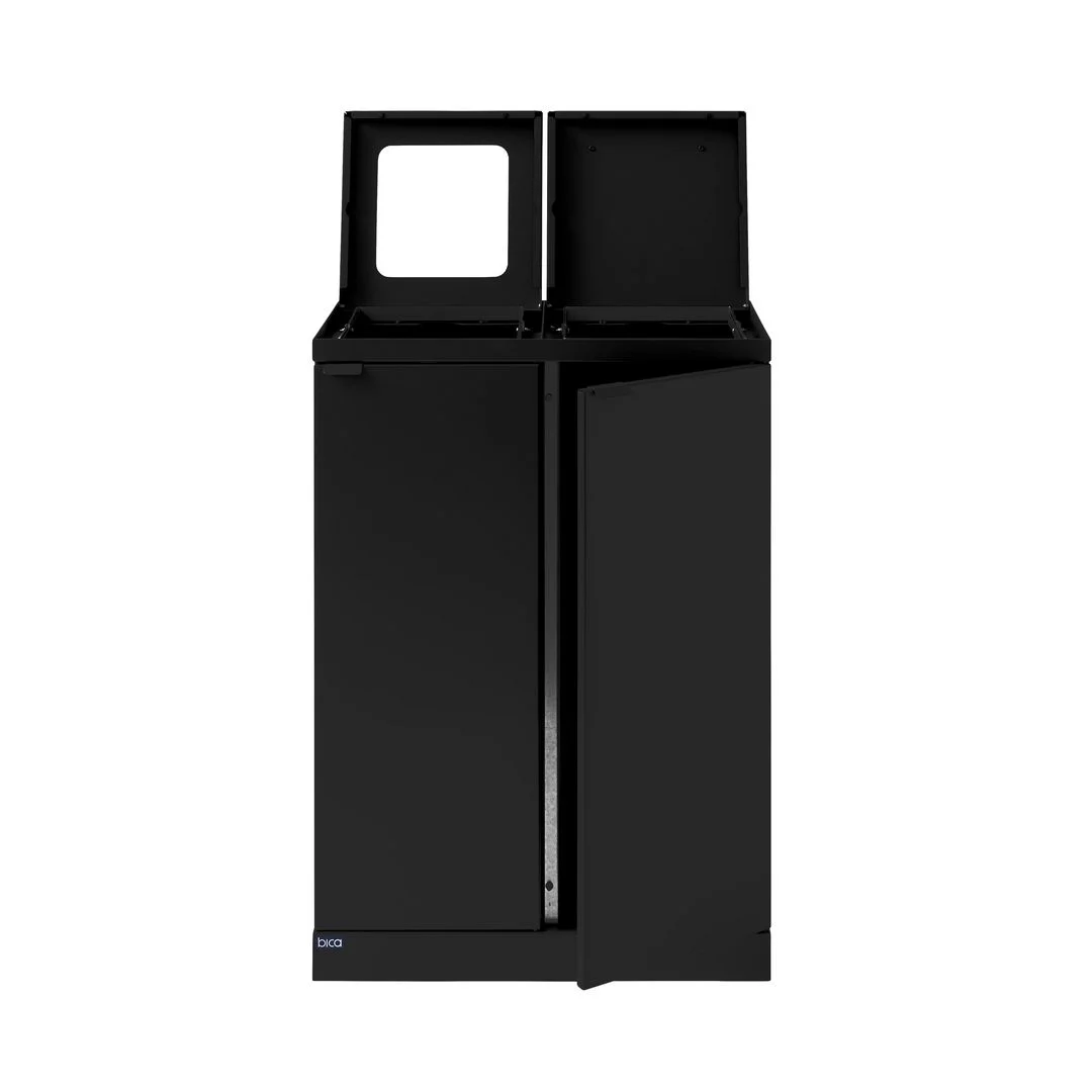 Elegant avfallssystem med 2 inndelinger i stilig design. Dette er et fleksibelt avfallssystem fra Bica som sørger for enkel og brukervennlig avfallssortering på arbeidsplassen. Avfallssystemet er utformet med 2 fraksjoner, henholdsvis en med åpen deponering og en med lokk med håndtak. Hensikten med lokket er å minimere luktplager og hindre bananfluer ved sortering av matavfall. En virkelig smart løsning hvis posen ikke tømmes veldig ofte. Avfallssystemet er utstyrt med frontdører med soft close for ergonomisk riktig tømming uten tunge løft.