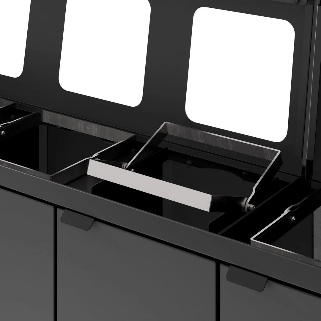 Elegant avfallssystem med fire inndelinger i stilig design. Dette er et fleksibelt avfallssystem fra Bica som sørger for enkel og brukervennlig avfallssortering på arbeidsplassen. Avfallssystemet er utformet med 4 deler, henholdsvis tre åpne innkast og en med løftelokk. Dette avfallssystemet er perfekt for arbeidsplasser med få ansatte og for mindre rom og tekjøkken. Avfallssystemet er utstyrt med frontdører med soft close for ergonomisk riktig tømming uten tunge løft. Integrert med sterke poseholdere, slik at posen blir liggende.