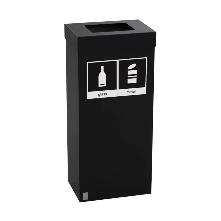 En komplett avfallsbeholder på hjul, topp og beholder lakket i RAL7021 SHR lakk, påsatt svart/hvit etiketter for glass + metall.