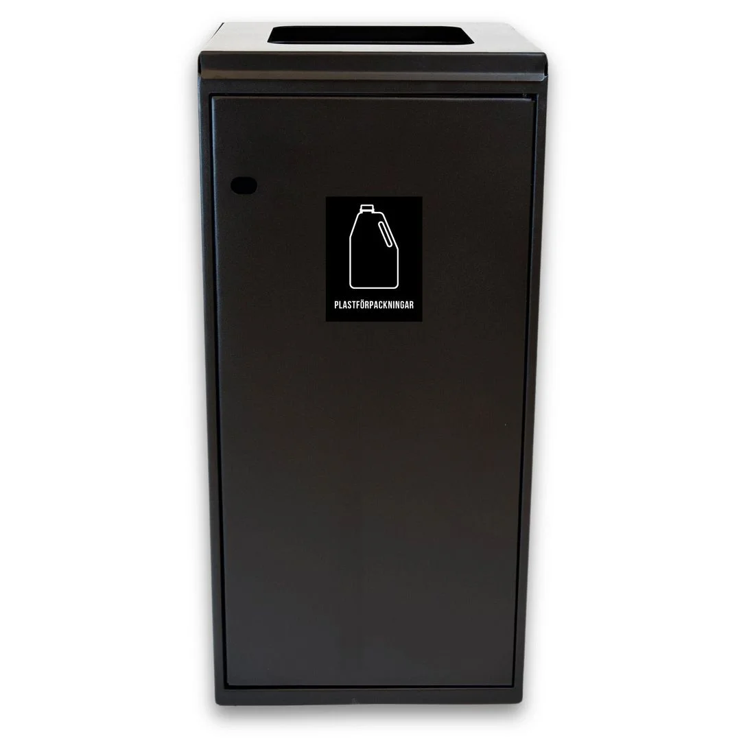 Utstyrt med døråpning for ergonomisk uttak av avfallssekk, samt justerbare føtter. Galvanisert og pulverlakkert stål 125L For innendørs og utendørs bruk Laget i Sverige av svensk stål.