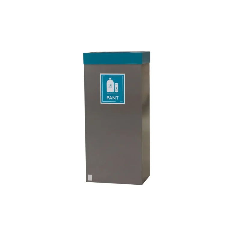 En komplett avfallsbeholder på hjul lakkert grå, med turkisblå pante topp, ferdig merket med turkisblå etikett for pant.