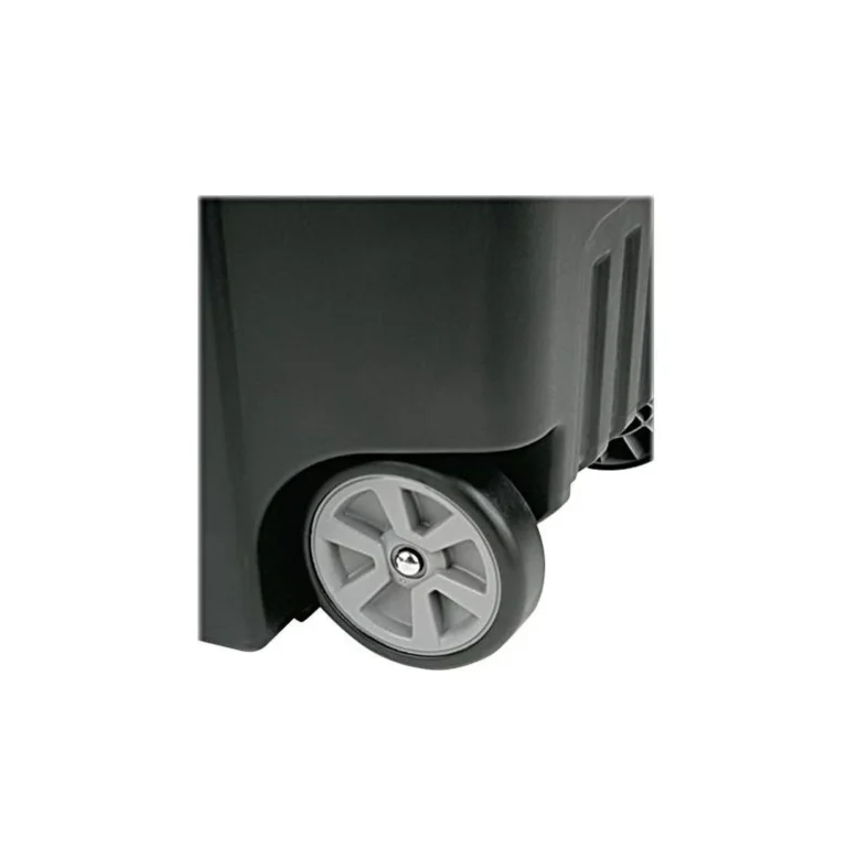 I robust plast til innendørs -og utendørs bruk,først og fremst i industrielle miljøer Høyt plassert bakre håndtak, store gummihjul og låsøye for hengelås Ofte brukt avfallssekk 160L.