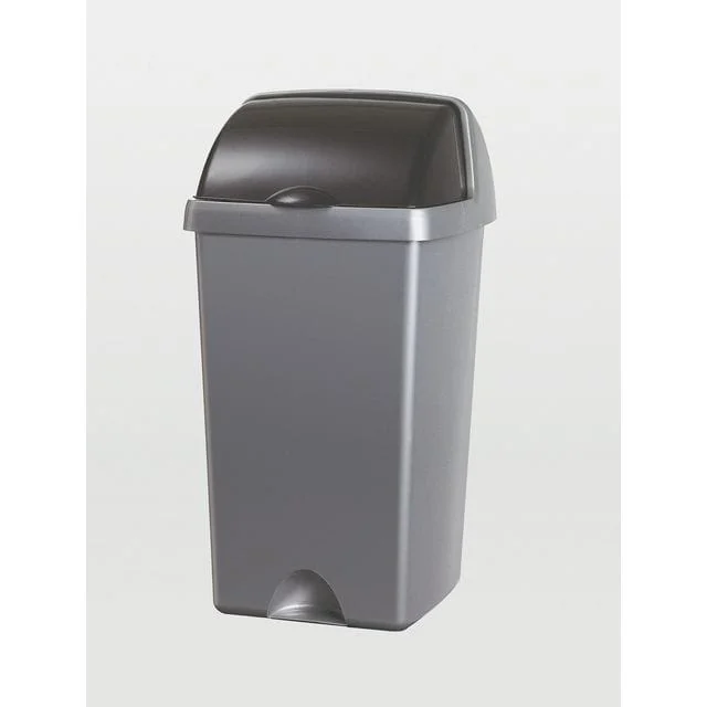 Sølvfarget avfallsdunk i kraftig plast med rullelokk.