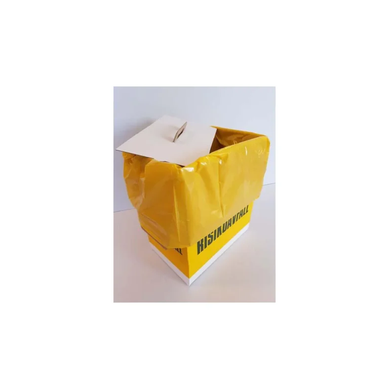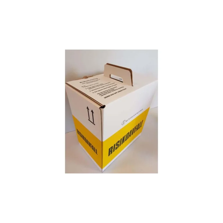 Avfallseske for risikoavfall, med bærehåndtak for transport av smittefarlig avfall. Avfallet samles i en avfallssekk for risikoavfall, lukkes med en strips og legges i risikoavfallsesken. – Mål ( LxBxH): 400x245x455mm – Materiale: Bølgepapp – Avfallssekk for risikoavfall og strips medfølger ikke, og må kjøpes separat