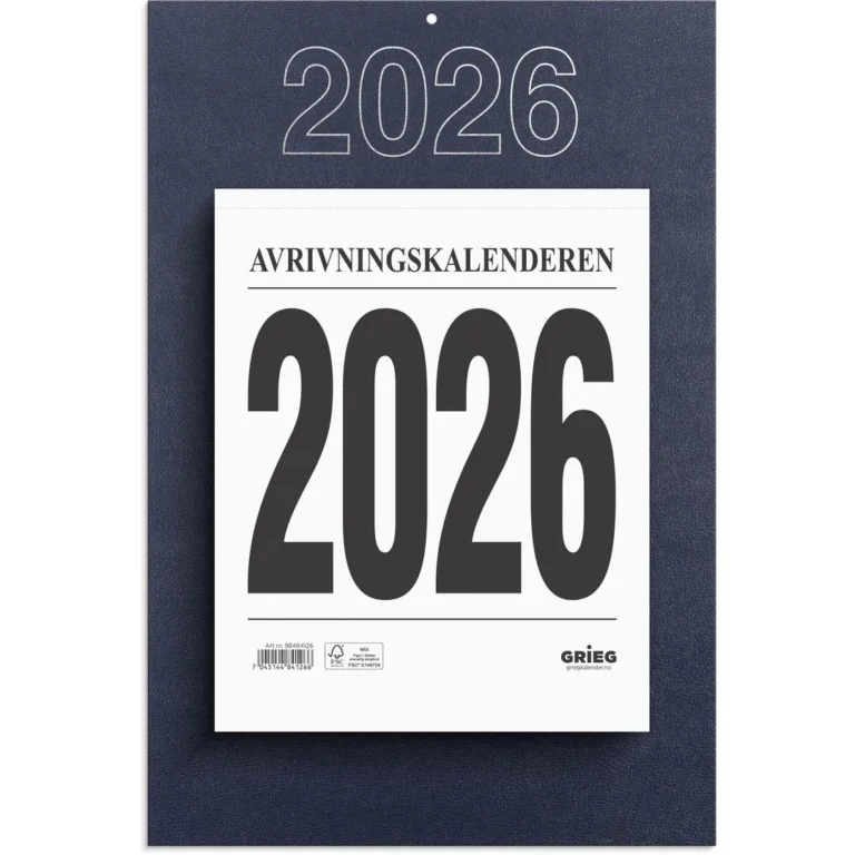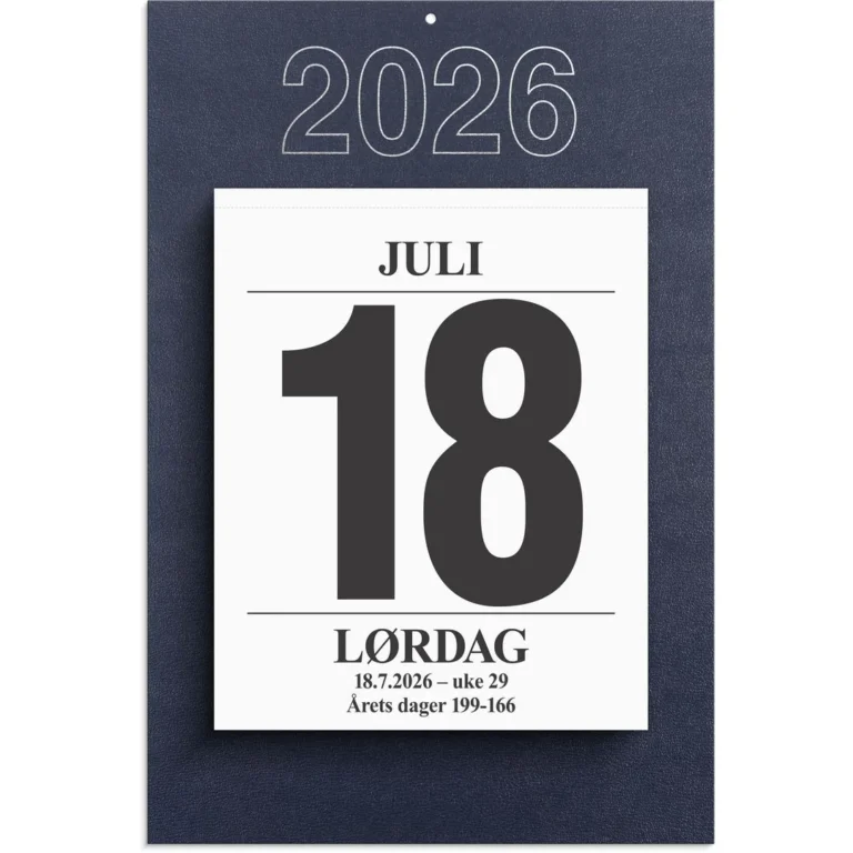 Kalenderen kommer med bakplate med hull for oppheng. Dag pr. side, med daglig praktisk info. Årets dager, helligdager og kongelige fødselsdager. Store tall gjør det lett å se datoen på avstand. Riv av for neste dag. Kalenderen er miljømerket FSC®, som betyr at hele produktet er produsert med papir og annet trevirke fra et ansvarlig og bærekraftig skogsbruk.