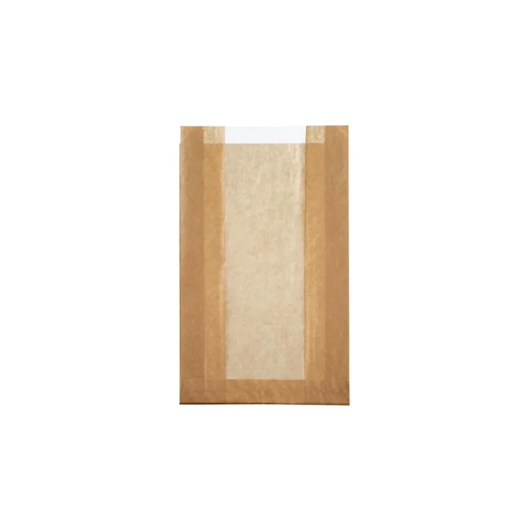 Brun papirpose med vindu, til bakervarer og lignende. Posen, inkludert vinduet, er laget av 100% papir og gjenvinnes som papiravfall.