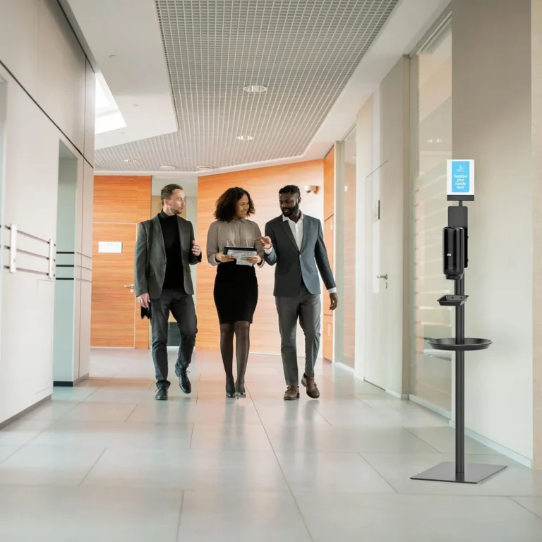 Ett stativ – to dispensere, betjener flere, tar mindre plass. Fleksibel monteringshøyde gjør tilgjengelighet enklere for flere.