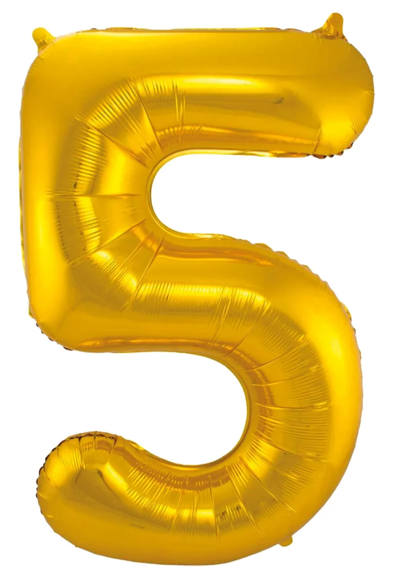Folieballong i form av tallet 5 i skinnende gull – hele 86 cm høy og perfekt som midtpunkt til bursdager eller jubileer. Kombiner med andre tall for å markere riktig alder.