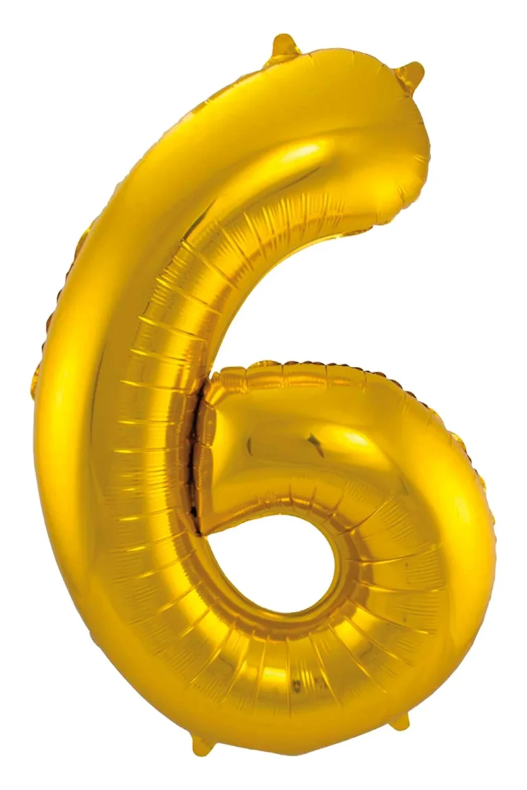 Folieballong i form av tallet 6 i skinnende gull – hele 86 cm høy og perfekt som midtpunkt til bursdager eller jubileer. Kombiner med andre tall for å markere riktig alder.