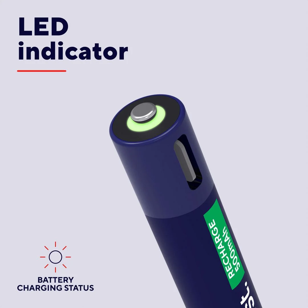 Lad disse batteriene direkte med den medfølgende USB-C-kabelen – ingen behov for engangsbatterier eller en klumpete lader. Dette 4-pakningen oppladbare AAA-batterier gir opptil 800 ladesykluser, slik at du kan bruke dem om og om igjen. De er i tillegg raske: fulladet på bare 2 timer. En innebygd indikatorlampe viser ladestatus og forteller når de er klare, slik at du raskt kan komme tilbake til det som er viktig.