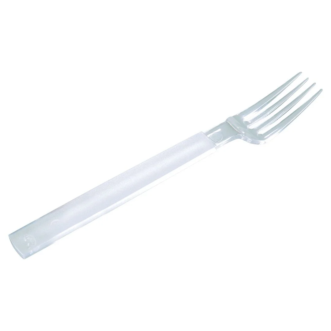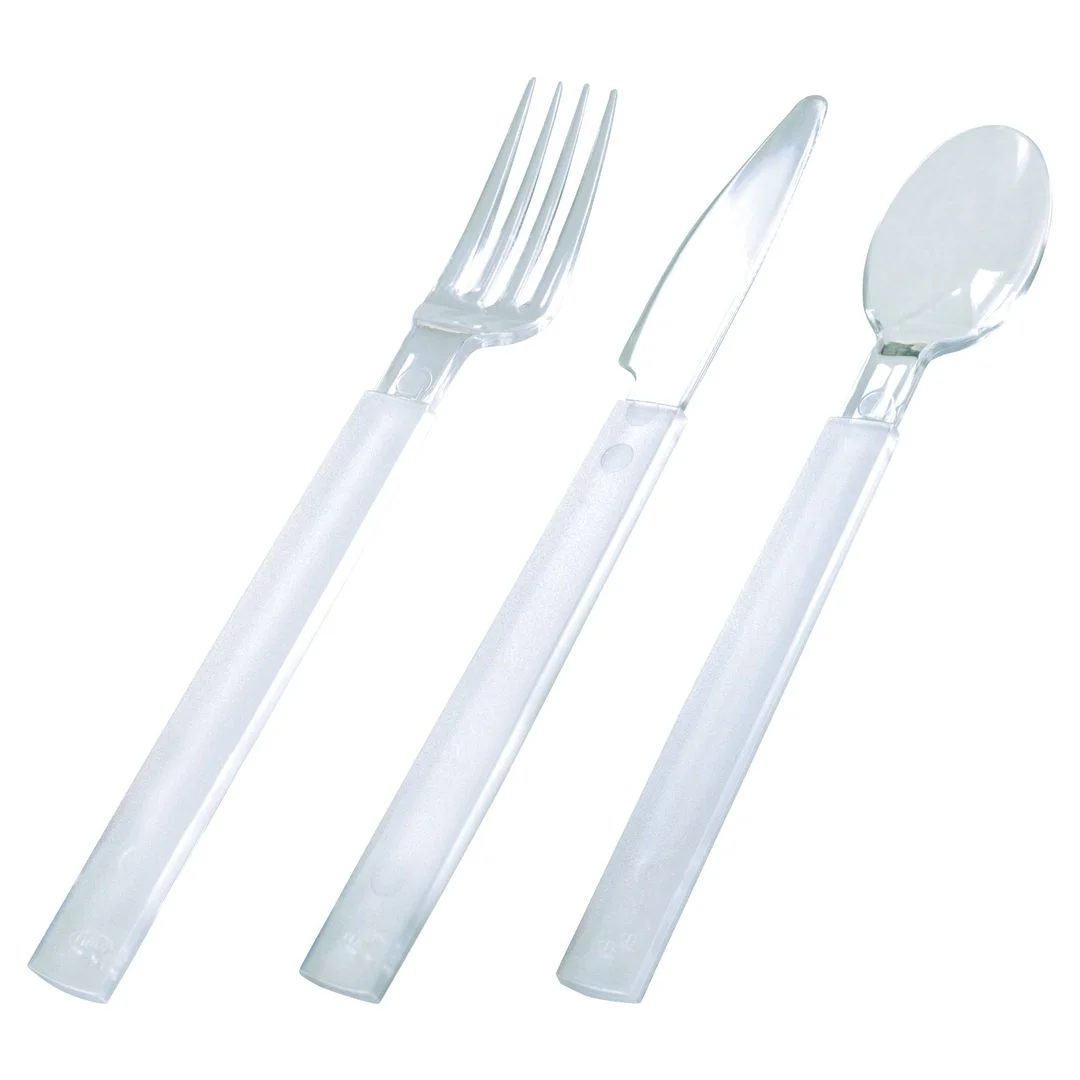 Bestikksettet Duni ReDine Clear inneholder 6 gafler, 6 kniver og 6 skjeer, og er fremstilt i solid PS. Dekk opp med både varm og kald mat, men merk at bestikket ikke er egnet for bruk i mikrobølgeovn. Maskinoppvaskbart bestikk for flergangsbruk.