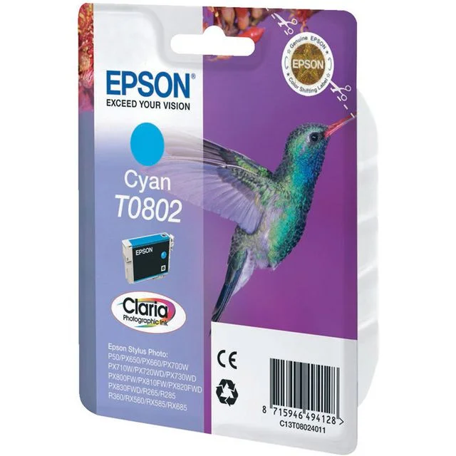 Espon T0802-blekk i cyan er et økonomisk valg for bilder av høy kvalitet og profesjonelle dokumenter Epson T0802 cyan blekkpatron har SmartValve-kontroll som utløser blekket jevnt og gir utskrifter av høy kvalitet. Spar penger ved å kun skifte fargen du er tom for.