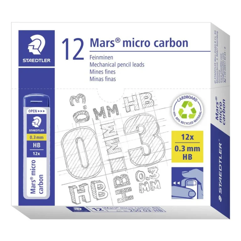 STAEDTLERs Mars® Micro Carbon blypåfyll er et ekstra sterkt bly for trykkblyanter. Dette STAEDTLER-blypåfyllet er svært lett å bruke. Det er bare å åpne trykkblyanten og slippe inn blyet. Blyet lager ikke-permanente streker som det er lett å viske bort fra mange glatte overflater, for eksempel plastikk, metall, lakk og lær.