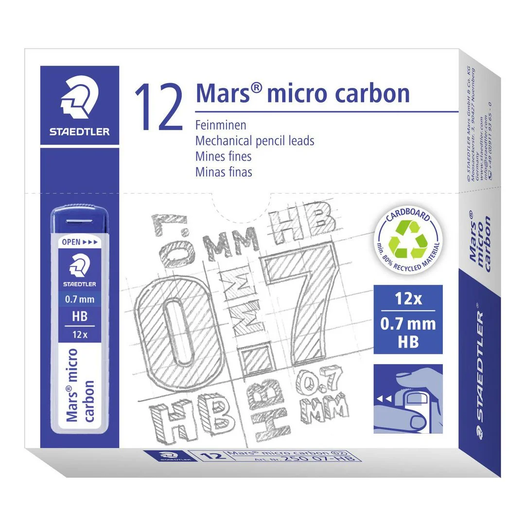 STAEDTLER’s Mars® Micro Carbon blypåfyll er et ekstra sterkt bly for trykkblyanter. Dette STAEDTLER-blypåfyllet er svært lett å bruke. Det er bare å åpne trykkblyanten og slippe inn blyet. Blyet lager ikke-permanente streker som det er lett å viske bort fra mange glatte overflater, for eksempel plastikk, metall, lakk og lær.