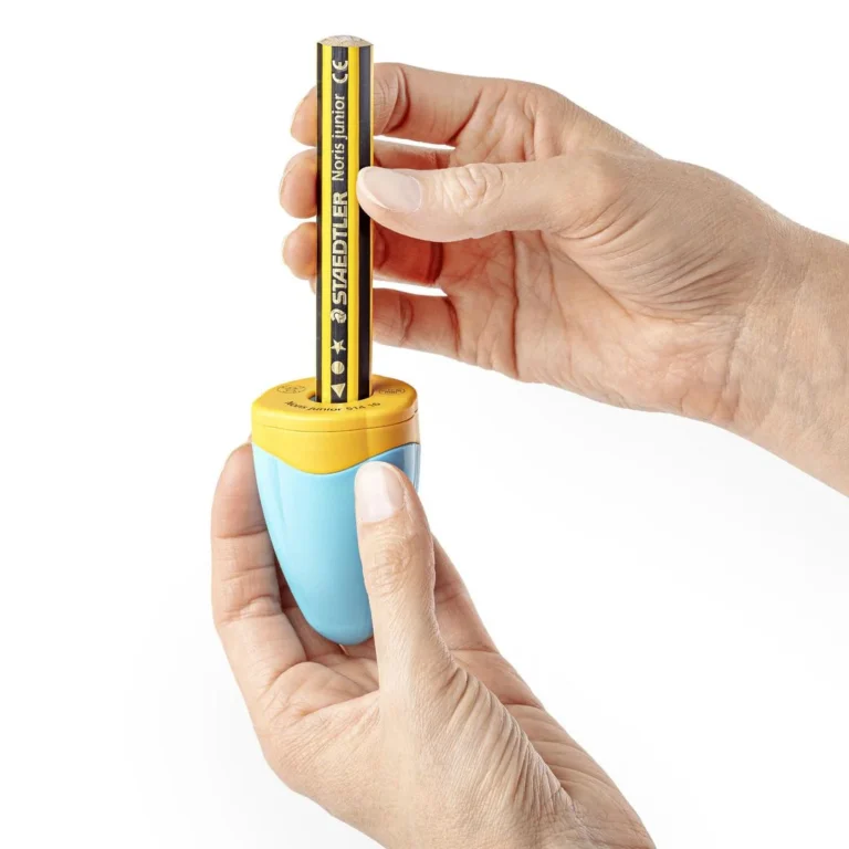 Noris® Junior beholderspisser turkis/gul. Kan brukes på 2 måter: enten ved å snu på blyanten eller på blyantspisseren. Kan vendes begge veier, og kan derfor brukes av både venstre- og høyrehendte.