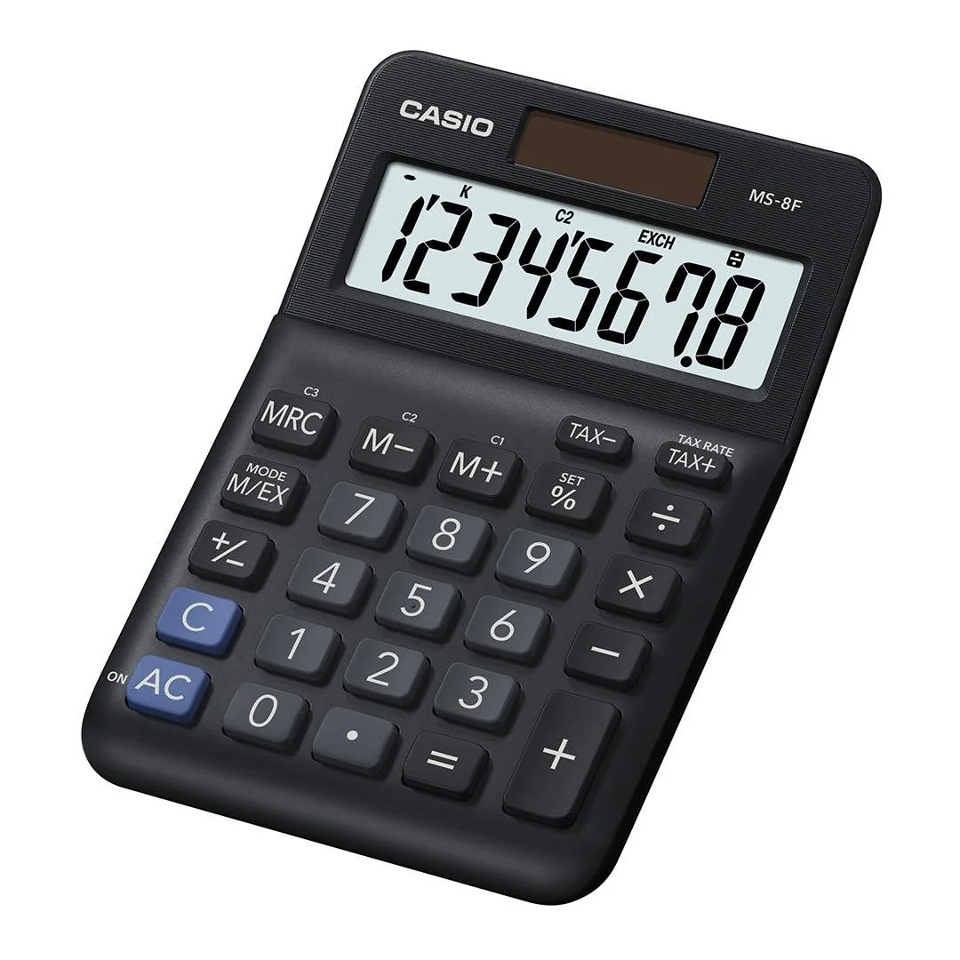 CASIO MS-8F Mini er en praktisk og stilren bordregner med 8-sifret ekstra stor LCD-skjerm for enkel avlesning, perfekt for kontor, butikk eller hjemmet. Tilbyr funksjoner som skatteberegning, kostnad/salg/margin og fortjenesteberegning.