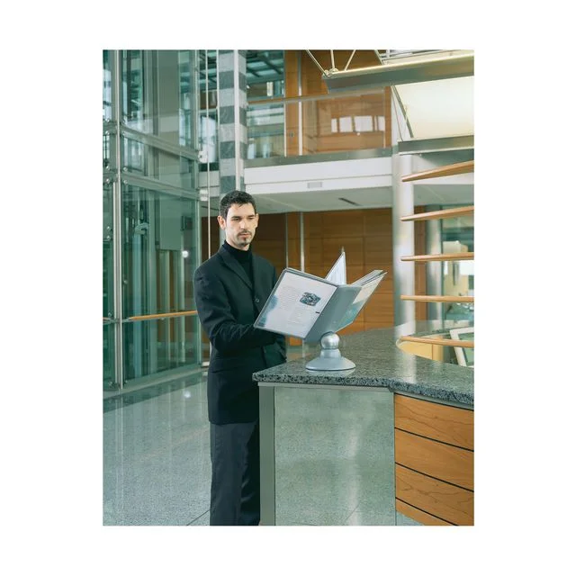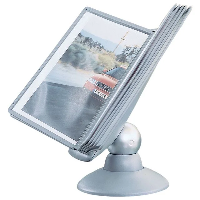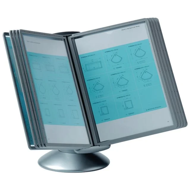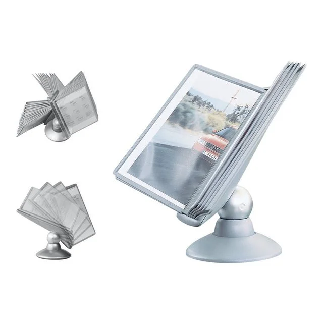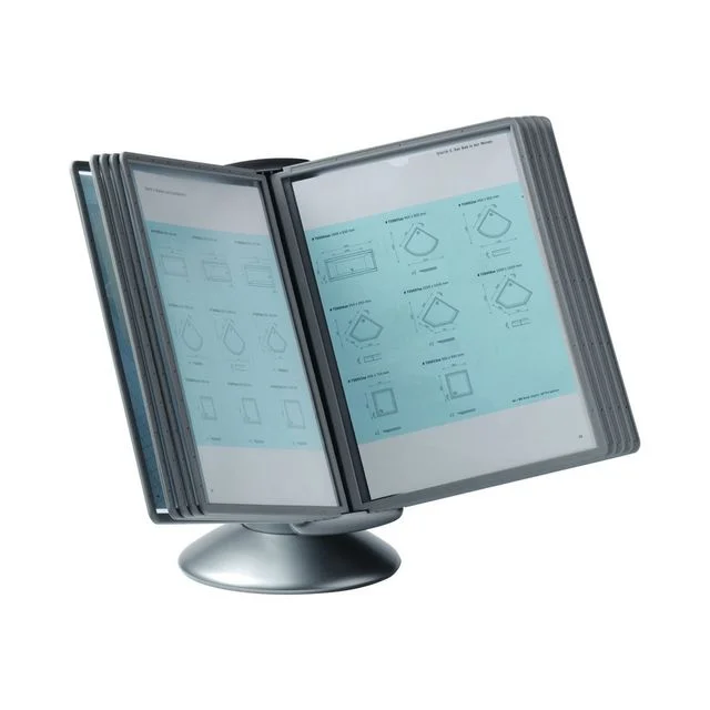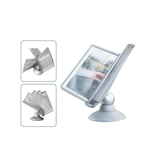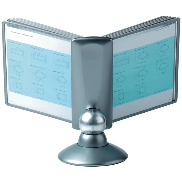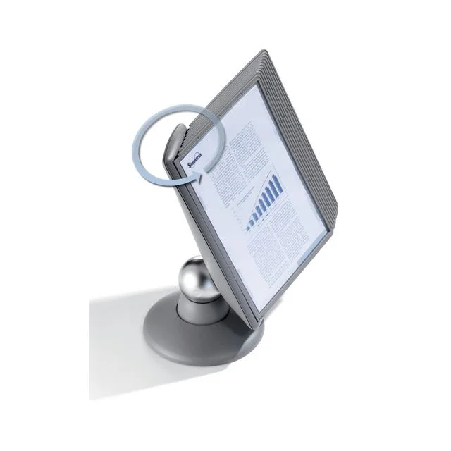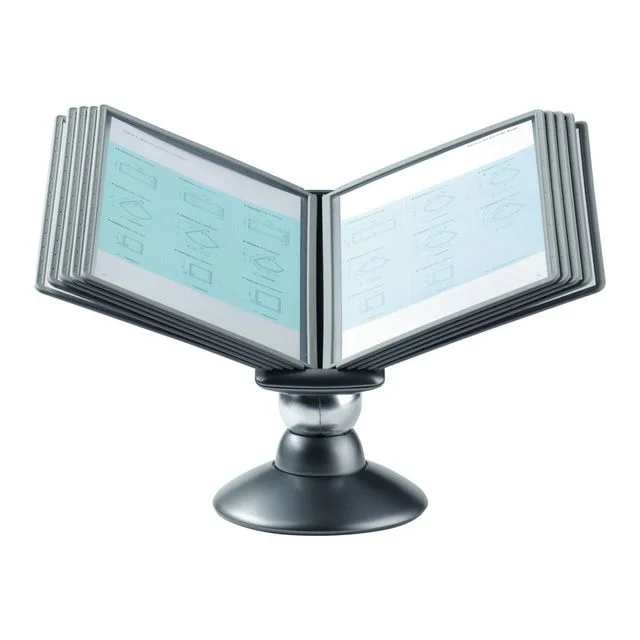 Bordstativ med 10 sorte lommer og rytter Kulen gjør systemet bevegelig og ergonomisk Roterbar 360° Lesevinkel kan stilles inn i lesevinkel 25°- 70° Velegnet for ståpult/skrivebord og arbeidsplasser som står mot hverandre 5-års garanti.