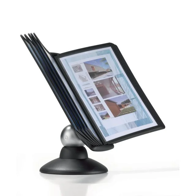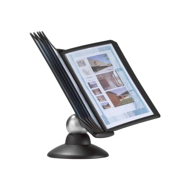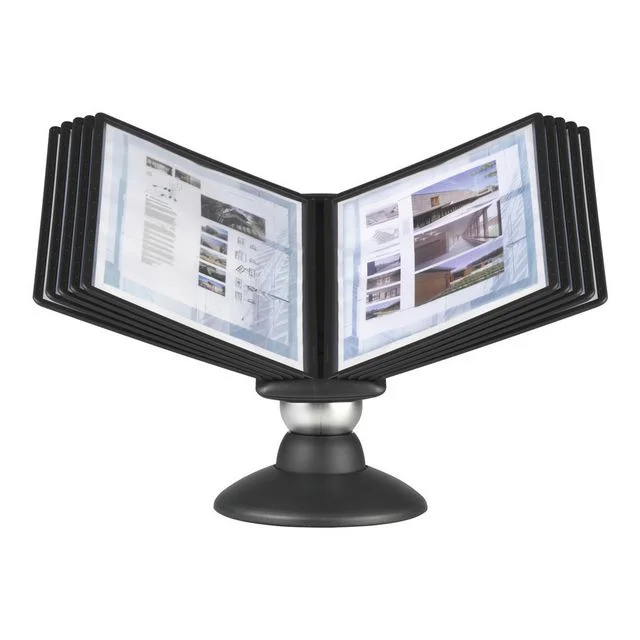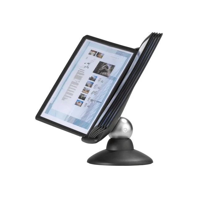 Bordstativ med 10 sorte lommer og rytter Kulen gjør systemet bevegelig og ergonomisk Roterbar 360° Lesevinkel kan stilles inn i lesevinkel 25°- 70° Velegnet for ståpult/skrivebord og arbeidsplasser som står mot hverandre 5-års garanti.