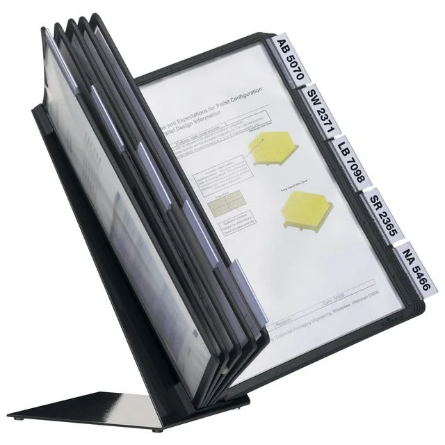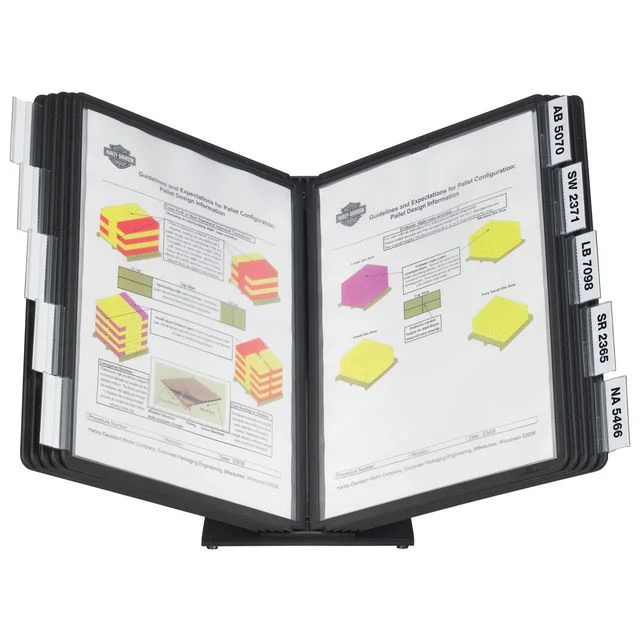 Metallsokkelen kan legges flatt på skrivebord eller arbeidsstasjoner, mens de refleksjonsfrie panelene er enkle å skanne for å dele eller lage duplikater. Vario-bordstativet og -panelsystemet har ti infopaneler og faner for organisering som gjør det enkelt å sette opp effektive kontorprosesser eller mekaniske prosesser. Presenter informasjon på en beskyttende og organisert måte Antireflekterende rammer for skanning Robust metallsokkel for festing av paneler.