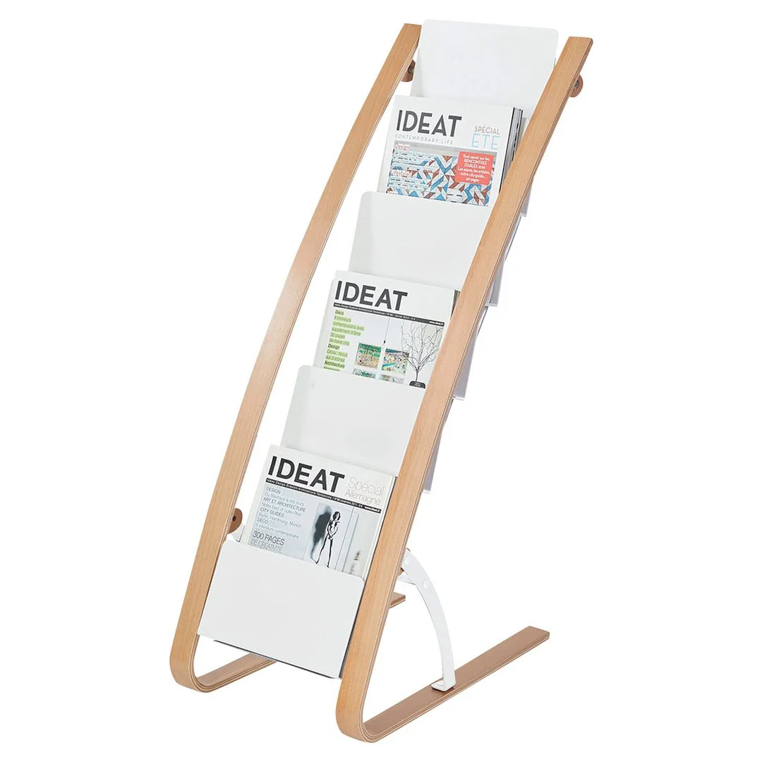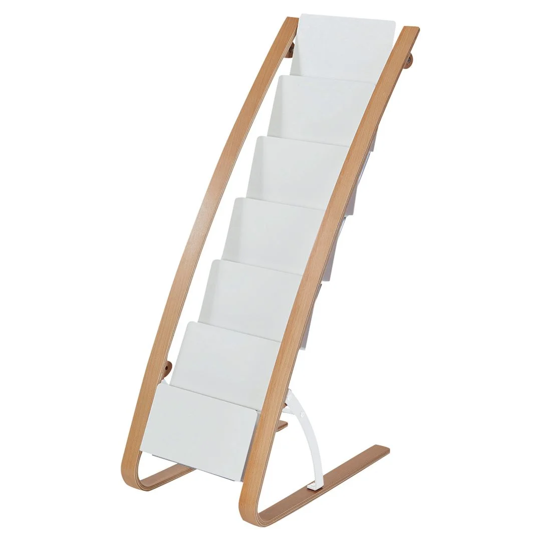 Stilrent og mobilt brosjyrestativ med 6 rom for dokumenter og magasiner Dette gulvstativet fra ALBA i hvitt tre gir seks rom for organisering av brosjyrer, dokumenter eller magasiner.