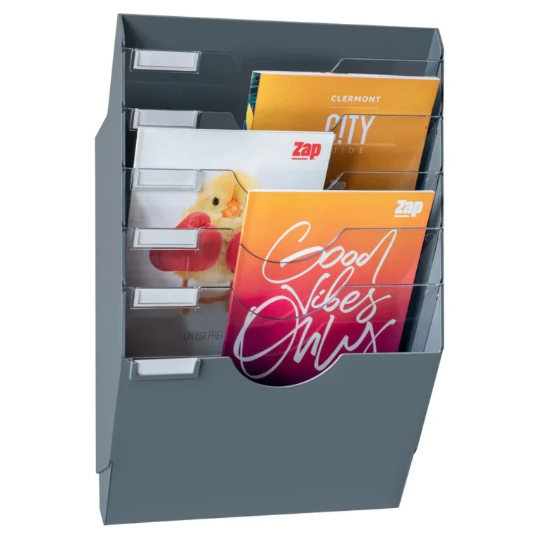 - CEP brosjyrestativ med 6 rom og avtakbare skillevegger gir fleksibel oppbevaring. Festes sikkert til enhver metalloverflate med sterke magneter. Perfekt for tykke dokumenter opptil 24 x 32 cm, med en kapasitet på opptil 7 kg. Laget av motstandsdyktig, resirkulert plast.