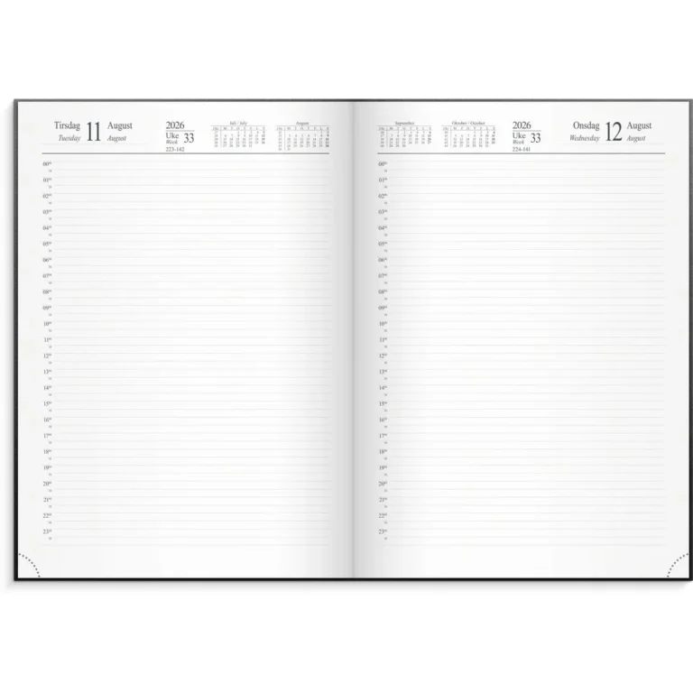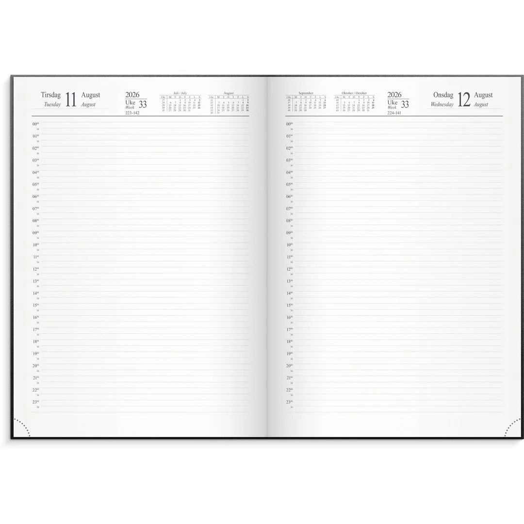Kalenderen har en linje for hver halvtime, hele døgnet, og en dag per side mandag – søndag. Den har norsk og engelsk kalendarium, hjørneperforering og lesebånd slik at man har kontroll på hvor i boken man er. Den inneholder kalendariske opplysninger, telefonguide, månedsoversikt, årsoversikt, månefaser, helligdager og kongelige fødselsdager.