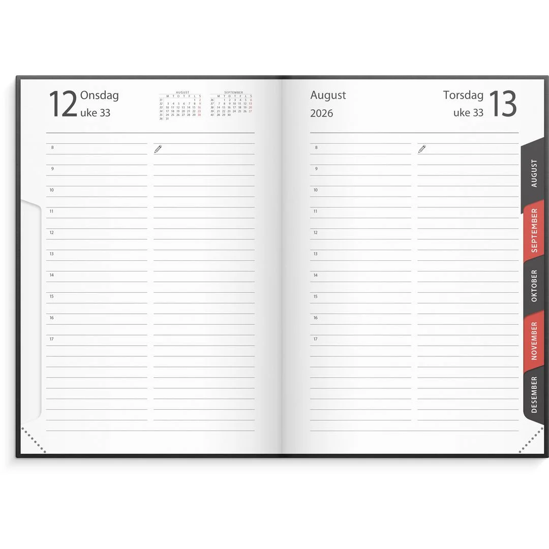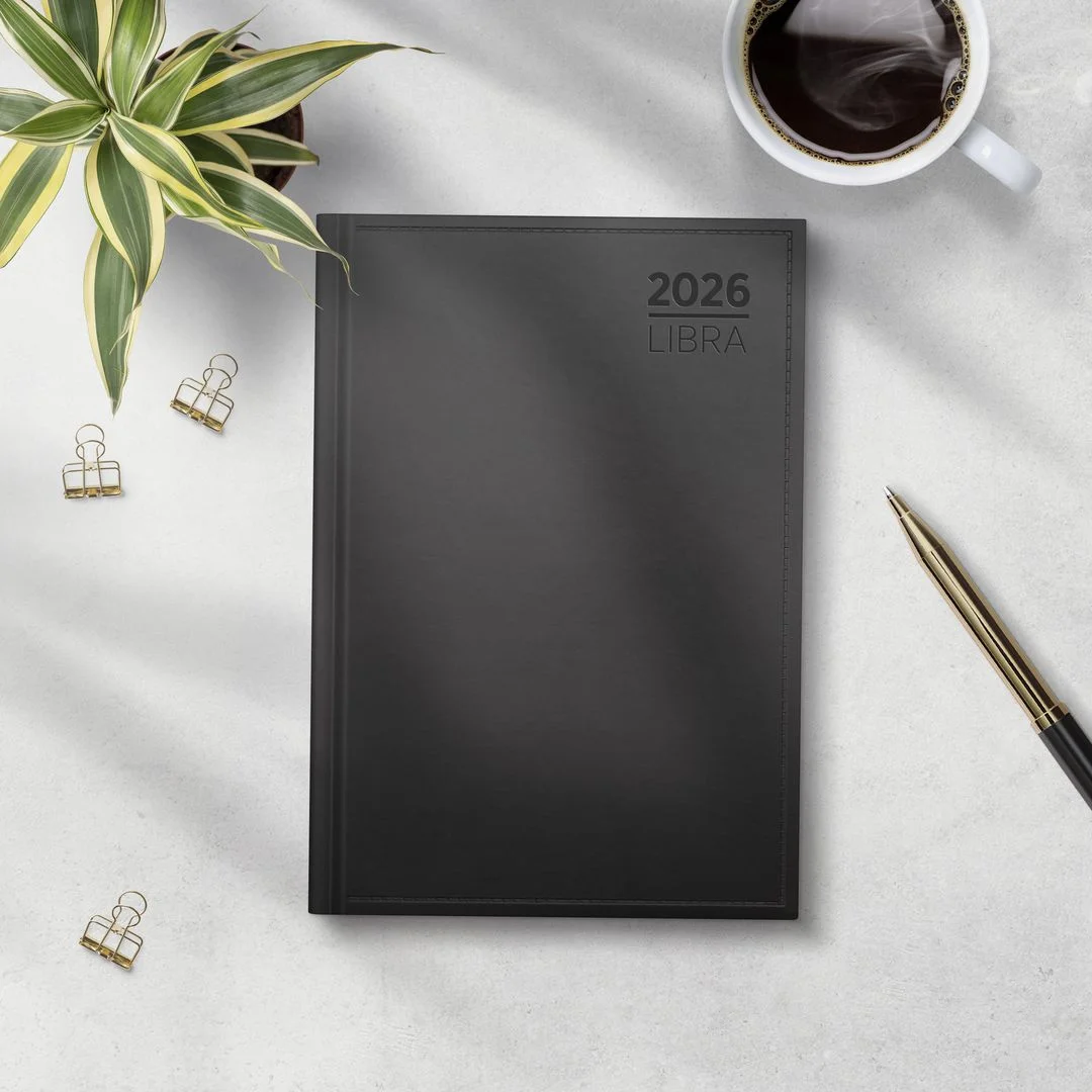Kalenderen er en del av en større serie med Libra kalendere. Felles for disse er at de har et hendig format som gjør den enkel å ta med seg, og en dag pr side gir deg masse plass til å skrive ned dine avtaler og notater. Utstanset månedsregister gjør det enkelt å finne rett måned. Bruk lesebåndet til å markere hvor i kalenderen du er. Hel side på lørdag og søndag.