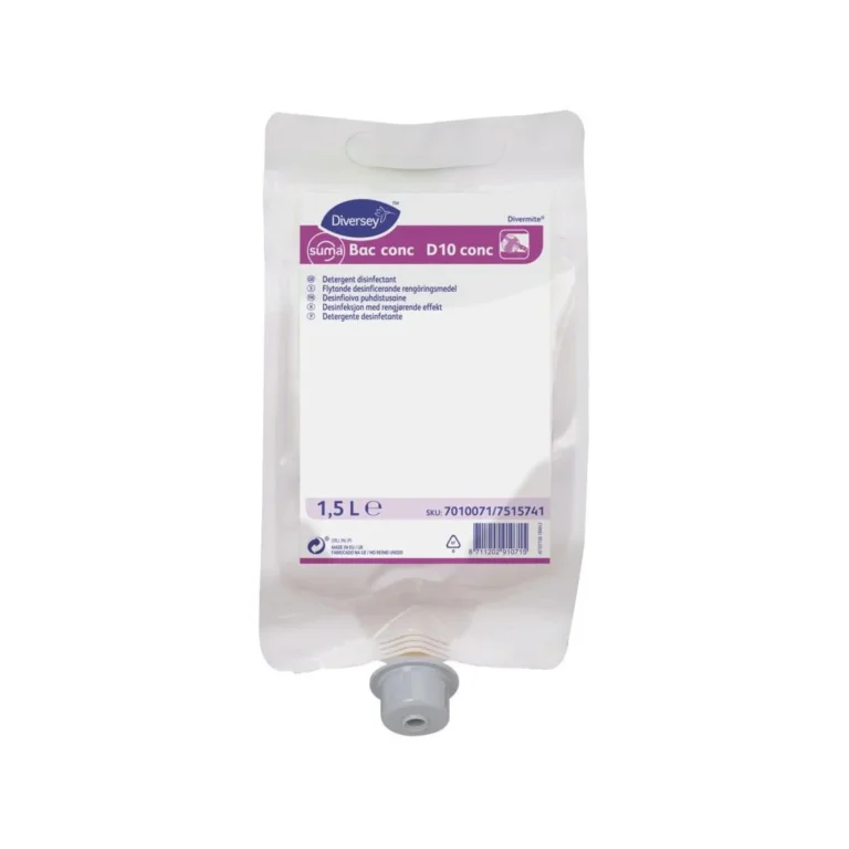 Suma® Bac D10 er et konsentrert, førsteklasses rengjøringsmiddel med ekstra desinfeksjonskraft. Formelen inneholder en blanding av overflateaktive stoffer som bryter ned fett, størknede matrester og andre rester med letthet. Væsken er laget med tanke på flater for profesjonell mattilberedning og dreper effektivt et bredt spekter av bakterier under alle vannforhold og holder lokalene hygieniske og sikre. Løsningen er fri for parfyme og etterlater et friskt rom etter rengjøring.