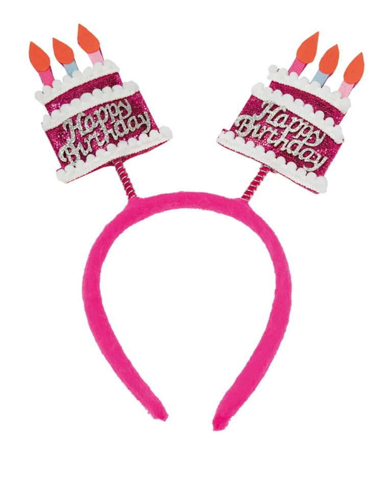 Hårbøyle Happy Birthday med to bursdagskaker på fjærer som gjør at de gynger på herlig vis. På kakene står teksten ‘Happy Birthday’ – One size (passer voksne og barn)
