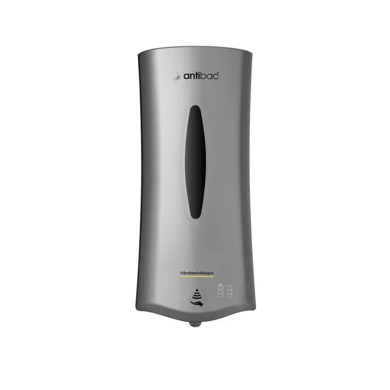 Indikatorer viser væskenivå og batteristyrke, og lyser opp når man beveger seg i nærheten. Dråpefanger (tilbehør) klikkes enkelt på plass i dispenseren Låsbar i toppen med nøkkel Dispenseren kan monteres både på vegg og gulvstativ, og har en fleksibel bakplate med monteringshull Pumpen aktiveres ved at man fører hånden under dispenseren.
