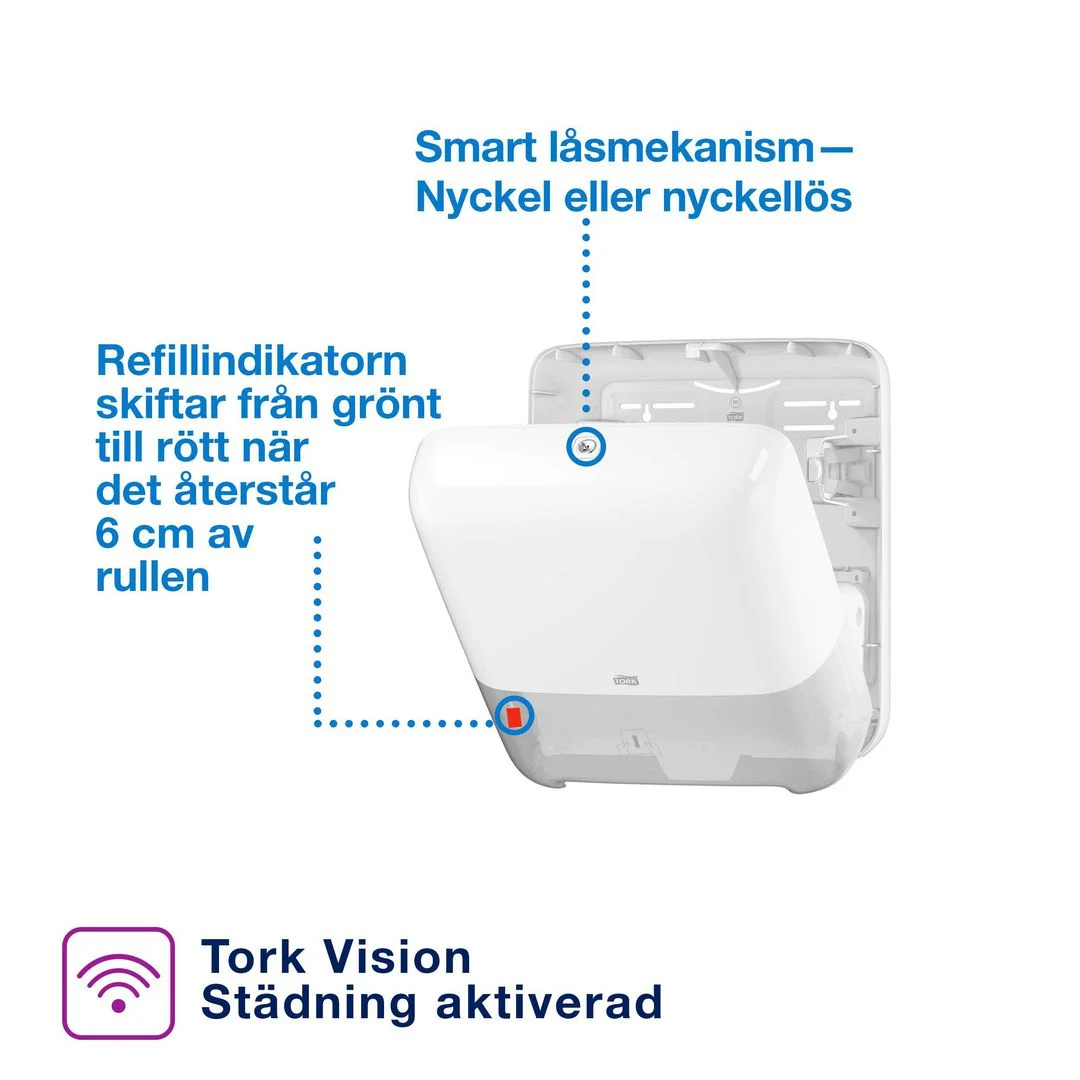 Tørkerullsystem somhar høy kapasitet og er utmerket for høyt trafikerte toalettrom og vaskestasjoner i mange ulike miljøer. Berøringsfri, du berører kun papiret du skal bruke Enkel påfyllingsfunksjon Ett papirhåndkle av gangen Hygienisk spak som bare er synlig ved påfylling eller når papiret ikke er tilgjengelig Video.