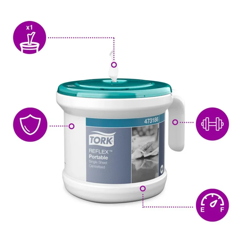 Tork Reflex bærbar senterrull dispensersystem med utmating av ett tørk om gangen er den ideelle løsningen for å tørke hender og overflater i profesjonelle miljøer. Dispenseren er enkel å bruke, hygienisk, robust og reduserer forbruket med opptil 37% sammenlignet med Tork senterrull-systemet. Den passer perfekt for bruk innen matproduksjon, for rengjøringsbyråer og mobile områder.