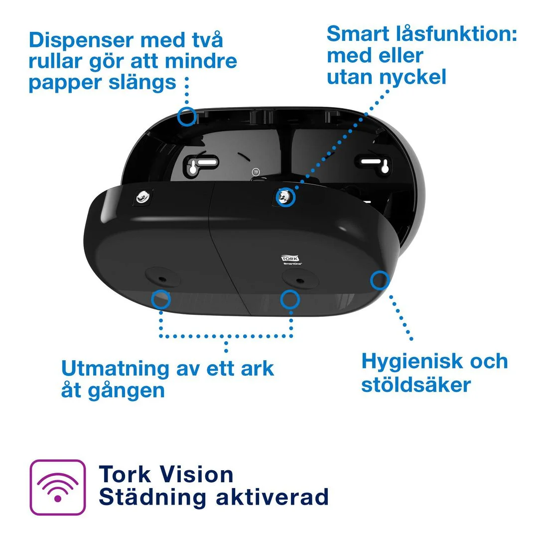 På grunn av plass til to ruller og at den avgir ett tørk av gangen reduseres forbruket med opptil 40 % sammenlignet med tradisjonelle jumborulldispensere, noe som igjen betyr flere besøk per rull. Utmating av enkeltark bidrar til å redusere forbruket med opptil 40 % hygienisk fordi gjestene bare tar på det papiret de skal bruke svært robust design med metallnøkkel og lås som beskytter rullen og forhindrer tyveri ekstra høy kapasitet sparer tid til vedlikehold og sikrer at det alltid er papir tilgjengelig Twin rulldispenser tillater at hele rullen blir brukt opp og minimerer avfall av rull.