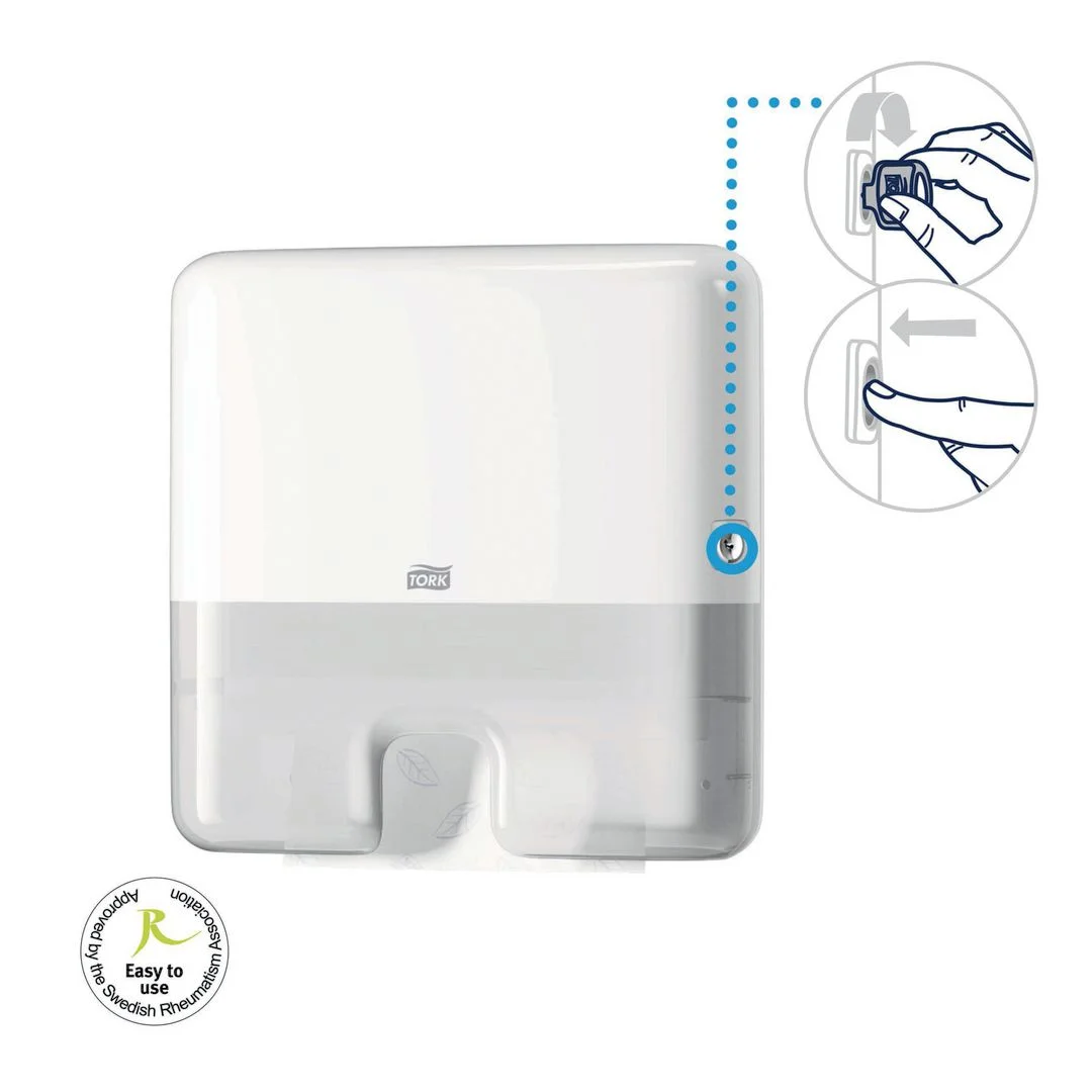 Den kostnadseffektive dispenseren er enkel å bruke og gir ut ett tørkepapir om gangen, noe som reduserer mengden avfall. Slankt og attraktivt design med høyglanset finish passer godt inn på et elegant toalettrom. Beskyttelse mot overfylling, garantert god utmating Ekstra slank utforming, tiltalende og plassbesparende Åpnes fra siden, enkel å fylle på, opptil 1,5 bunker Avgir et og et håndtørk av gangen, gir redusert forbruk By på effektivitet på toalettrom med lav til middels pågang med denne dispenseren for brettede tørkepapir Egnet til H2 refiller fra Tork.