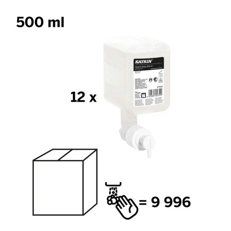 Produktet er pakket i en resirkulerbar beholder og er nok til 833 doser. Inneholder milde ingredienser for sensitiv hud og er spesielt egnet for hyppig bruk. Dermatologisk testet og godkjent. Passer til Katrins såpedispenser 500ml. Dermatologisk testet Luft- og bakterietett flaske med engangsventil.