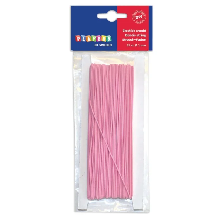 Rosa elastisk tråd av høy kvalitet laget av latex og polyester. Lett å håndtere for barn og utmerket for å lage elastiske armbånd og halskjeder eller personlige nøkkelringer. – Lengde: 25m – Farge: Rosa