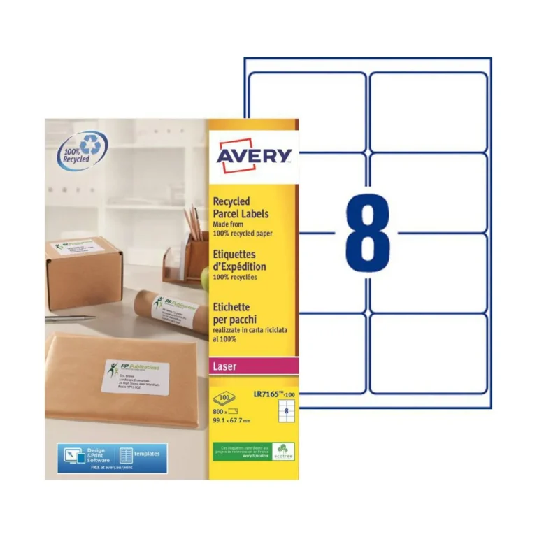 Avery LR7165-100 etiketter med QuickPEEL™ av gjenbrukspapir. De er produsert av gjenbrukspapir, har et vannbasert lim og er pakket i gjenbrukskartong.