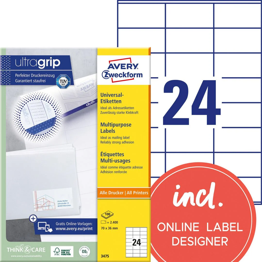 Etikettene kleber godt og permanent på alle type glatte overflater. Papirkvaliteten er optimalisert slik at du får flotte, knivskarpe trykk uansett hvilken skriver du bruker. 24 etiketter /ark 2400 etiketter/pk Ultragrip™-teknologi for perfekt justering Tilpass etikettene ved hjelp av gratis Avery &: Print Design-programvare. Video.