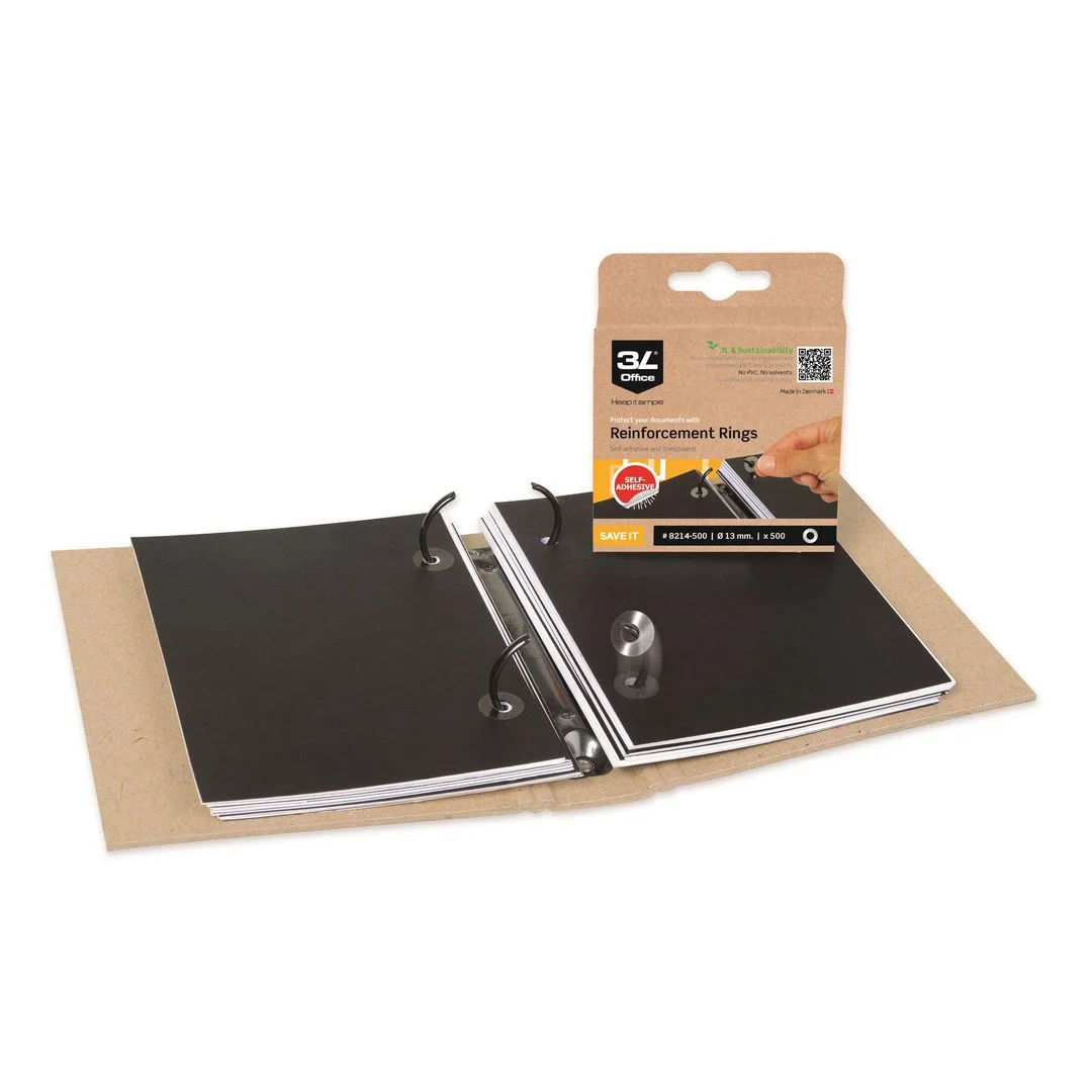 Ideell for dokumenter som ofte tas inn og ut av ringpermer. Kan brukes til å reparere allerede revne sider. Gjennomsiktige PP forsterkningsringer 13 mm diameter.