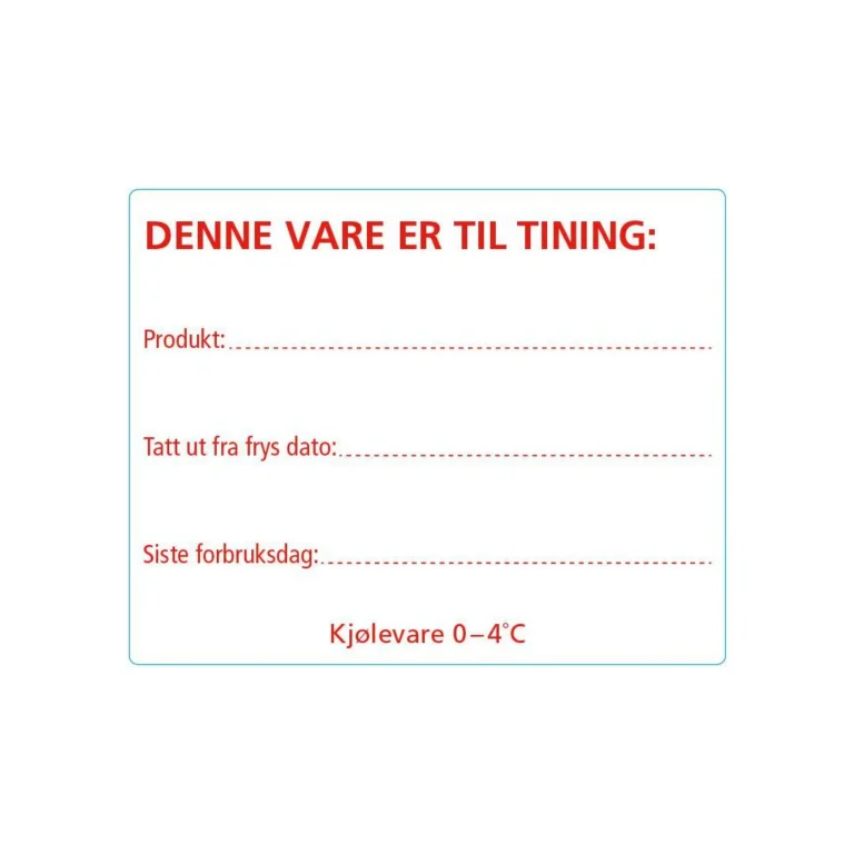 Fortrykt etikett ‘vare til tining’. – Størrelse: 102x128mm. – 500 etiketter pr rull. – Kjerne: 40mm. – Fryselim.
